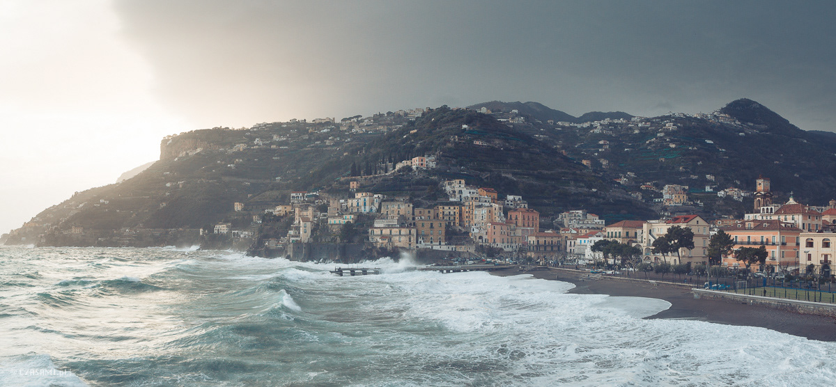 Muszę przyznać, że im bardziej kręte drogi i ciasne zakręty, tym bardziej radowała mnie jazda tym malcem, który swoją droga jak na standardy w tym rejonie mały nie jest. Do hotelu dotarliśmy wieczorem. Za punkt noclegowy obraliśmy miejscowość Minori. Malutka mieścina i gmina jednocześnie, która zgodnie z danymi jakie znalazłem ma 2km kwadratowe powierzchni i 2880 mieszkańców. W całej miejscowości miejsc parkingowych dostępnych dla przyjezdnych (płatne-niebieskie linie) jest może z 60 góra. Kilkanaście w porcie, ale nie zostawiajcie tam auta podczas sztormu, poważnie. Kolejne na głównej drodze, ale tylko parę. Okazało się, że termin wybraliśmy idealny, wystarczająco ciepło na spacery, ale za razem mało ludzi na ulicach. Dlatego prawie przez cały wyjazd udało nam się parkować za darmo. Oto i całe Minori w pełnej okazałości. Za pierwszą górą widać plaże kolejnej miejscowości, Maiori.