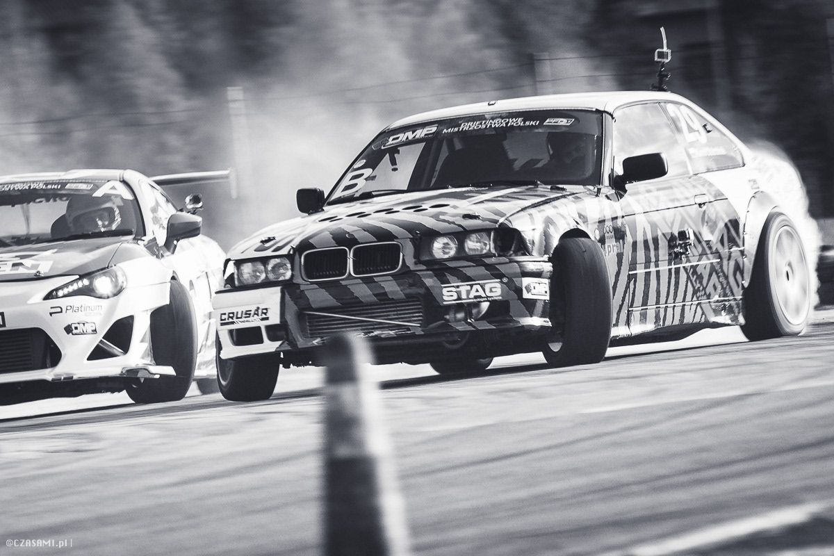 Jeśli znajdziecie się na imprezie takiej jak ta, czyli pełnej dynamicznej akcji i będziecie mieli aparat i chęci do uwiecznienia tego wydarzenia. Niezależnie czy będą to pokazy lotnicze, wyścig kolarski, rajdy samochodowe, wyścigi czy biegi Waszych dzieci na zawodach szkolnych.To może być nawet Wasza pociecha na huśtawce. Każde miejsce gdzie zależy Wam na ukazaniu ruchu. Podstawową techniką jaką będziecie stosować, z jaką powinniście się zapoznać wcześniej, jest panoramowanie (ang. Panning). Chodzi w niej o kontrolowanie czasu ekspozycji, przysłona odgrywa tutaj drugoplanowe znaczenie. Ustawiamy aparat w tryb pozwalający decydować o czasie naświetlania TV( w Canonie) S ( w Nikonie). AF ustawiamy w tryb ciągłego szukania ostrości AI Servo (Canon). Tryb zdjęć seryjnych będzie pomocny, ale nie jest konieczny. W całości chodzi o to aby cały czas śledzić obiekt w ruch, podążać za nim obiektywem jednocześnie wybierając na nim ostrość w sposób ciągły. Ważne aby w momencie wyzwolenia migawki w dalszym ciągu podążać aparatem za obiektem fotografowanym. Postarajcie się obracać się w takim samym tempie jak obiekt, wybierzcie sobie jeden punkt na obiekcie, którego będziecie pilnować punktem AF na matówce. To może być np.głowa czy koło. Jak bardzo uda się Wam wydłużyć czas ekspozycji zależy od wielu czynników. Szybkości obiektów, Waszej odległości od nich, ogniskowej jaką akurat używacie, stabilności Waszych rąk i doświadczenia. Ja zacząłem dzień od czasów 1/160 po wstrzeleniu się zszedłem do 1/80. Najlepsze jest to, że technikę tę możecie trenować wszędzie, można panoramować psy biegające w parku, można ptaki lecące, można też auta na ulicach. Teraz zobaczcie Drifting moim okiem.