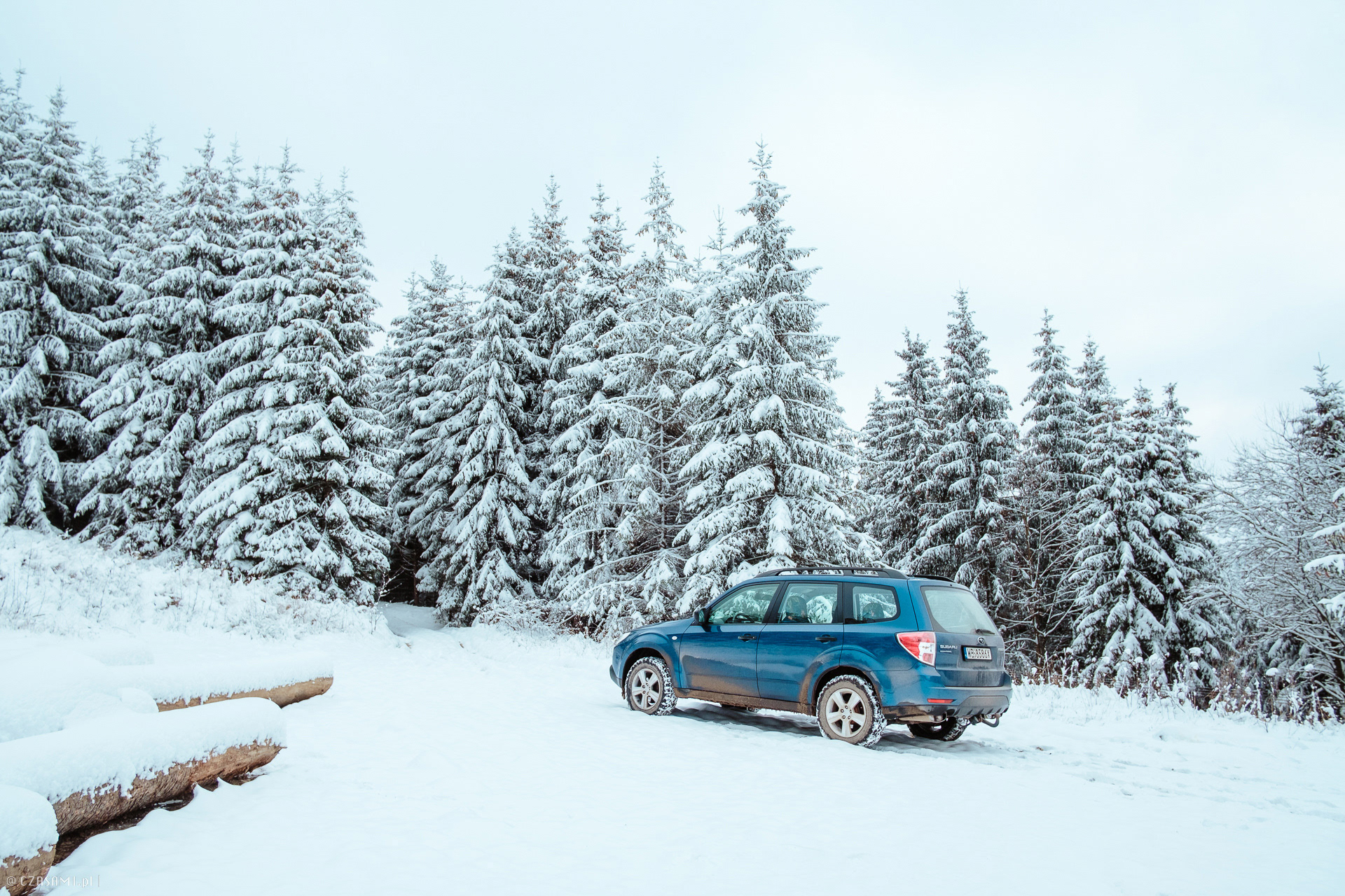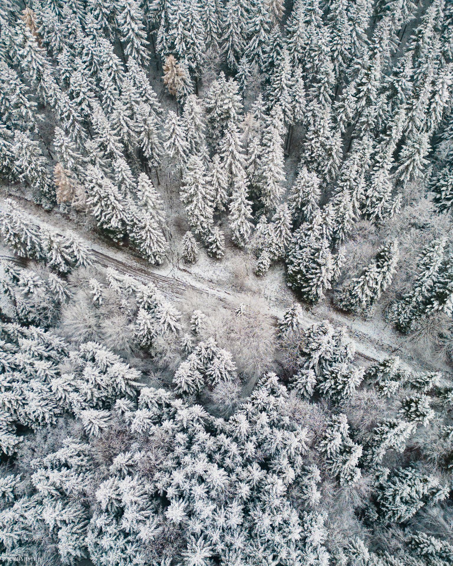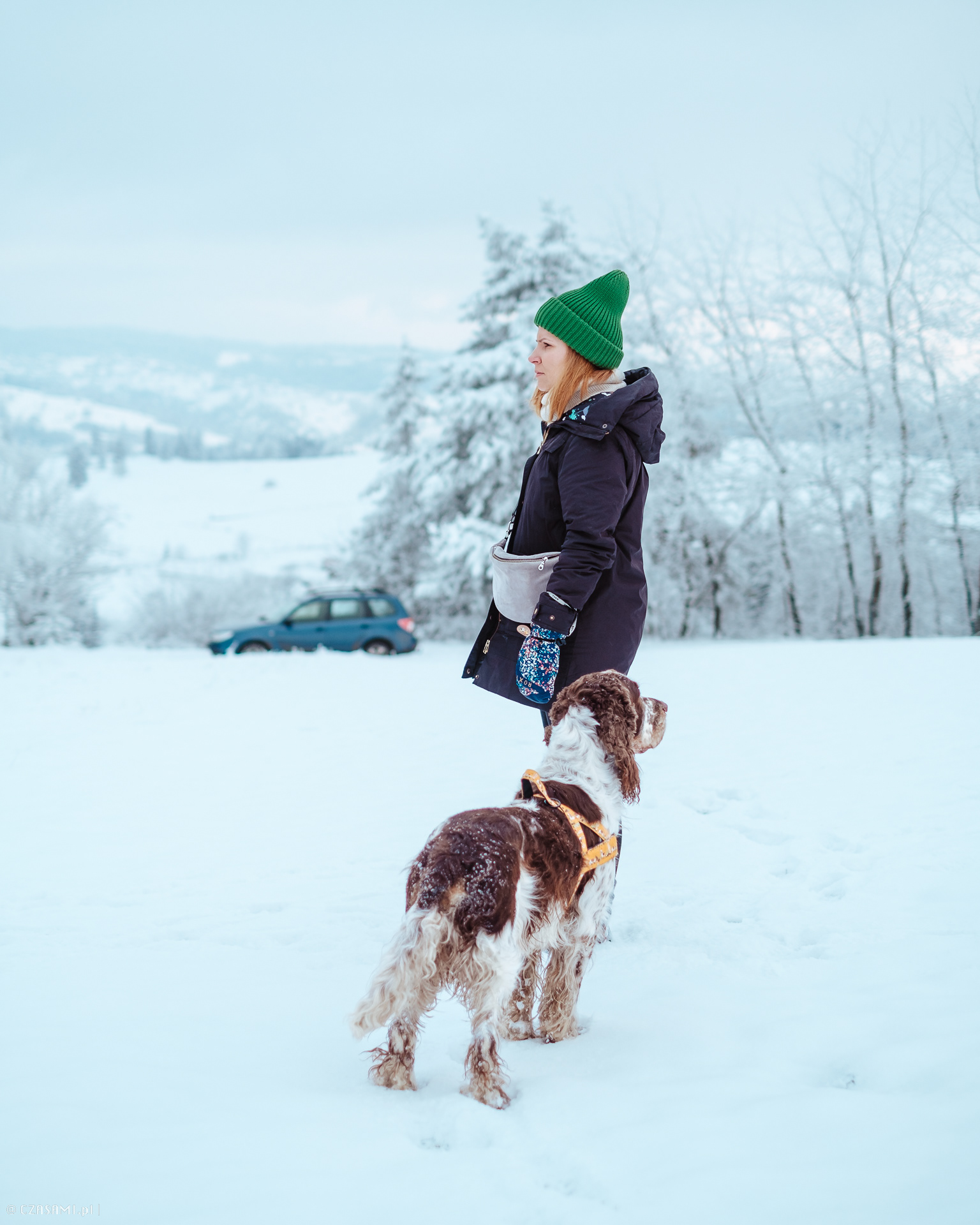 Czasami tak się dzieje, że plany na wyjazd zmieniają się zupełnie, a mimo to ciężko jest się nam złościć na los. Tak było w tej sytuacji. Dosyć spontanicznie zapragnęliśmy odwiedzić polskie góry, długo nie było okazji i już powoli odczuwaliśmy brak tych widoków. Teraz jednak trafiło się nam, jak przewidywaliśmy idealne okienko pogodowe. To miała być super okazja na łapanie resztek kolorów jesieni w górskich krajobrazach. Krótki weekendowy wypad na naładowanie baterii. Jak widzicie z kolorów głównie występują barwy naszych ubrań, szelek Piksela i auta. W dniu wyjazdu zaczął w górach obficie padać śnieg i to wystarczyło aby zupełnie zmienić wygląd tego miejsca. Zamiast kolorów jesieni mieliśmy piękny zimowy puch. Wszystko wyszło super...tylko buty zimowe by się przydały, bo stopy zmarzły nieźle. Na szczęście miałem rękawiczki bez palcy do dronowania bo bez tego nie byłbym w stanie latać tyle ile chciałem.