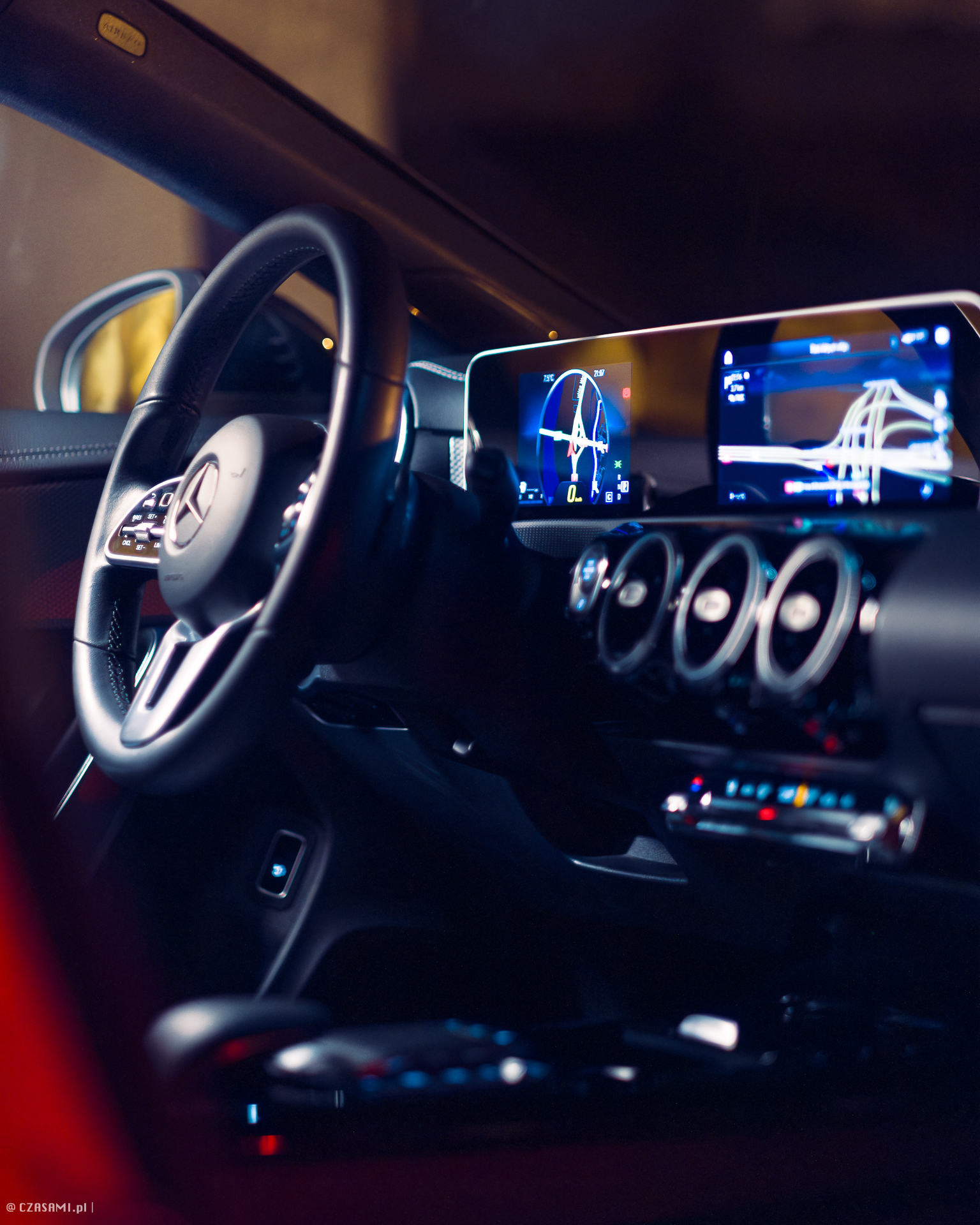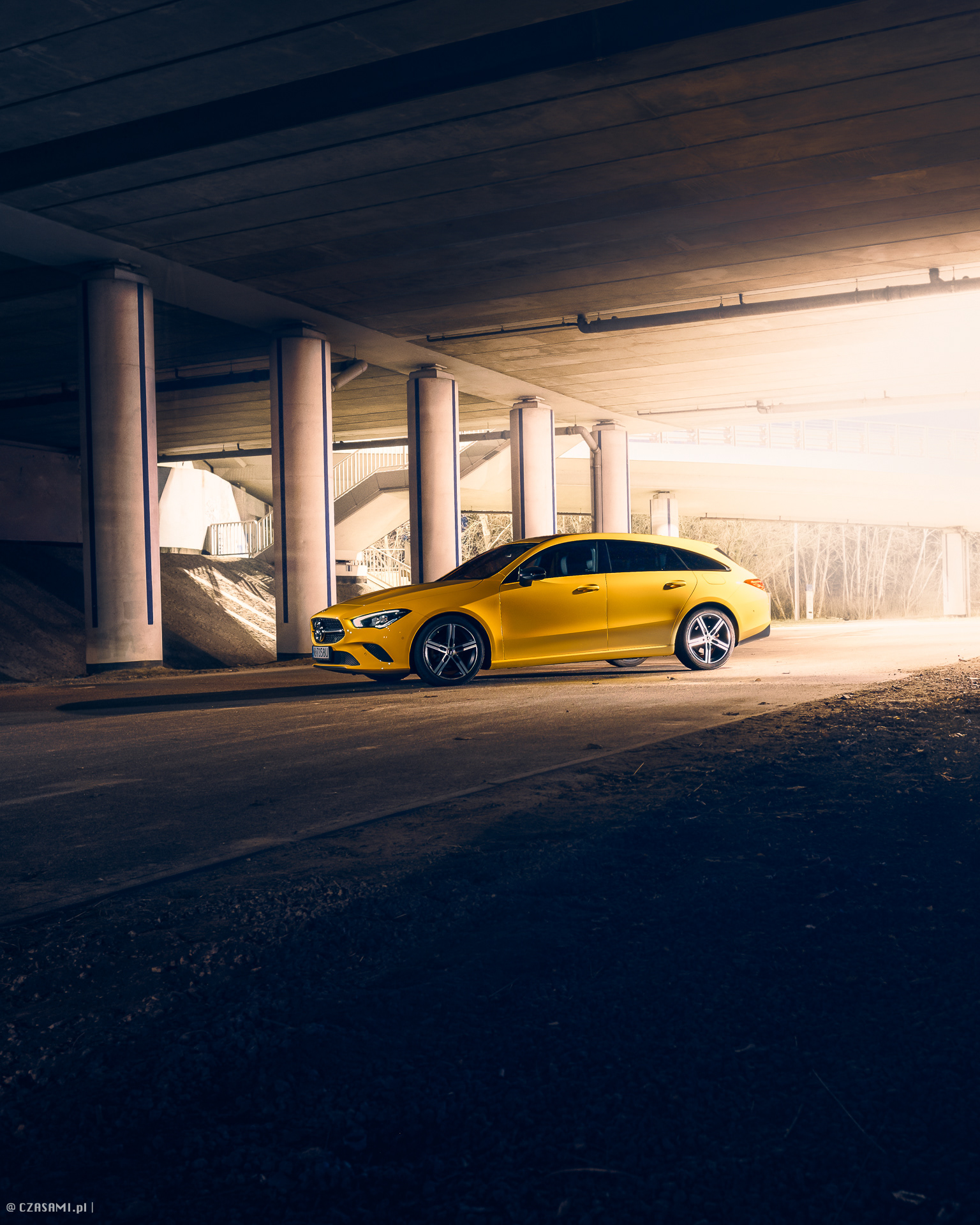 Nawet przygnębiająco deszczowy, zimowy i ponury wieczór może nabrać kolorów, gdy przed aparatem pojawi się tak słoneczne auto. Mercedes Benz CLA shooting brake.